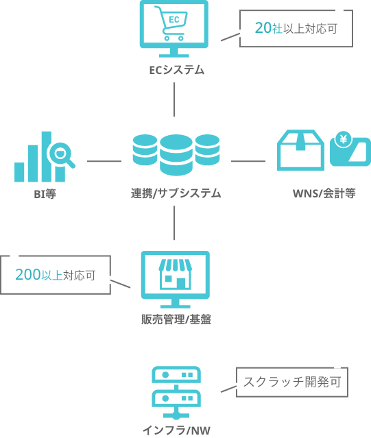 Frankartでは多様なECシステムや業務システムと柔軟に連携できる、拡張性と安定性に優れたEC基盤を構築しています。「連携/サブシステム」がコアとなり、20社以上の外部ECシステム、倉庫管理(WMS)・会計システム、BIツールなどと連携。さらに、200以上の販売管理・基幹システムと接続し、在庫・受注・売上管理などの基盤業務も一元管理が可能です。クラッチ開発にも対応しており、お客様の要件に応じた柔軟なシステム構築が行えます。本システム構成により、変化の激しいEC市場でも、顧客体験と業務生産性を両立する次世代のECプラットフォームを実現しています。